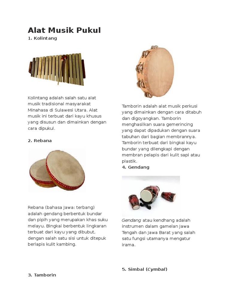 50 Alat Musik Tradisional Indonesia Beserta Asal Daerahnya from i0.wp.com Jenis alat musik tradisional yang cara memainkannya dipukul biasanya memiliki bentuk yang mirip dengan gendang. Drum merupakan alat musik yang dipukul. Terdapat beragam jenis alat musik yang dikenal masyarakat, baik alat musik lokal maupun alat musik mancanegara memiliki keragaman dalam berbagai hal. Membranofon (membranophone) adalah sebuah alat musik berdasarkan insturment yang sumber bunyinya berasal dari selaput atau membran yang cara penggunaan : Dengan memukul alat pemukul ke arah membran atau selaput berupa kulit hewan yang terdapat dibagian atas alat musik. Drum adalah satu jenis alat musik ritmis modern yang merupakan hasil pengembangan dari alat musik pukul tradisional. Berdasarkan cara memainkan, bentuk, serta bahan pembuatannya, alat musik ini sebetulnya tidak jauh berbeda dengan gendang jawa, hanya saja bentuk tabungnya yang ramping memanjang membuat ia umumnya. Alat musik pukul adalah alat musik yang dimainkan dengan cara di pukul.